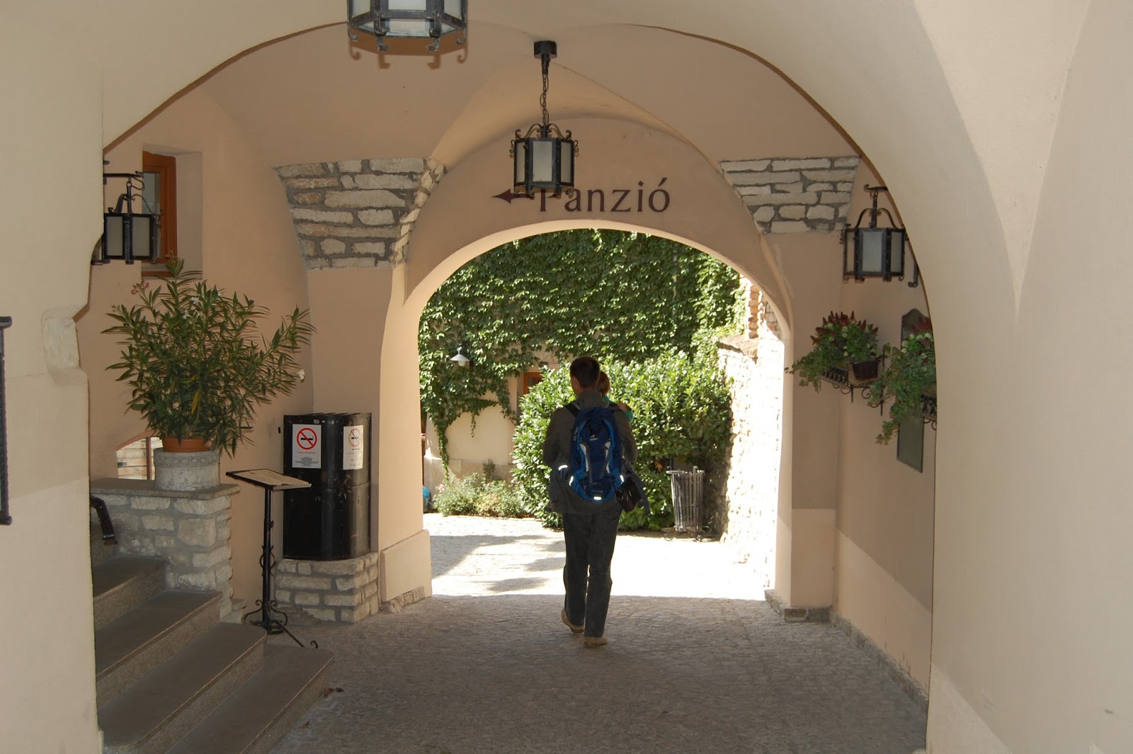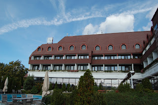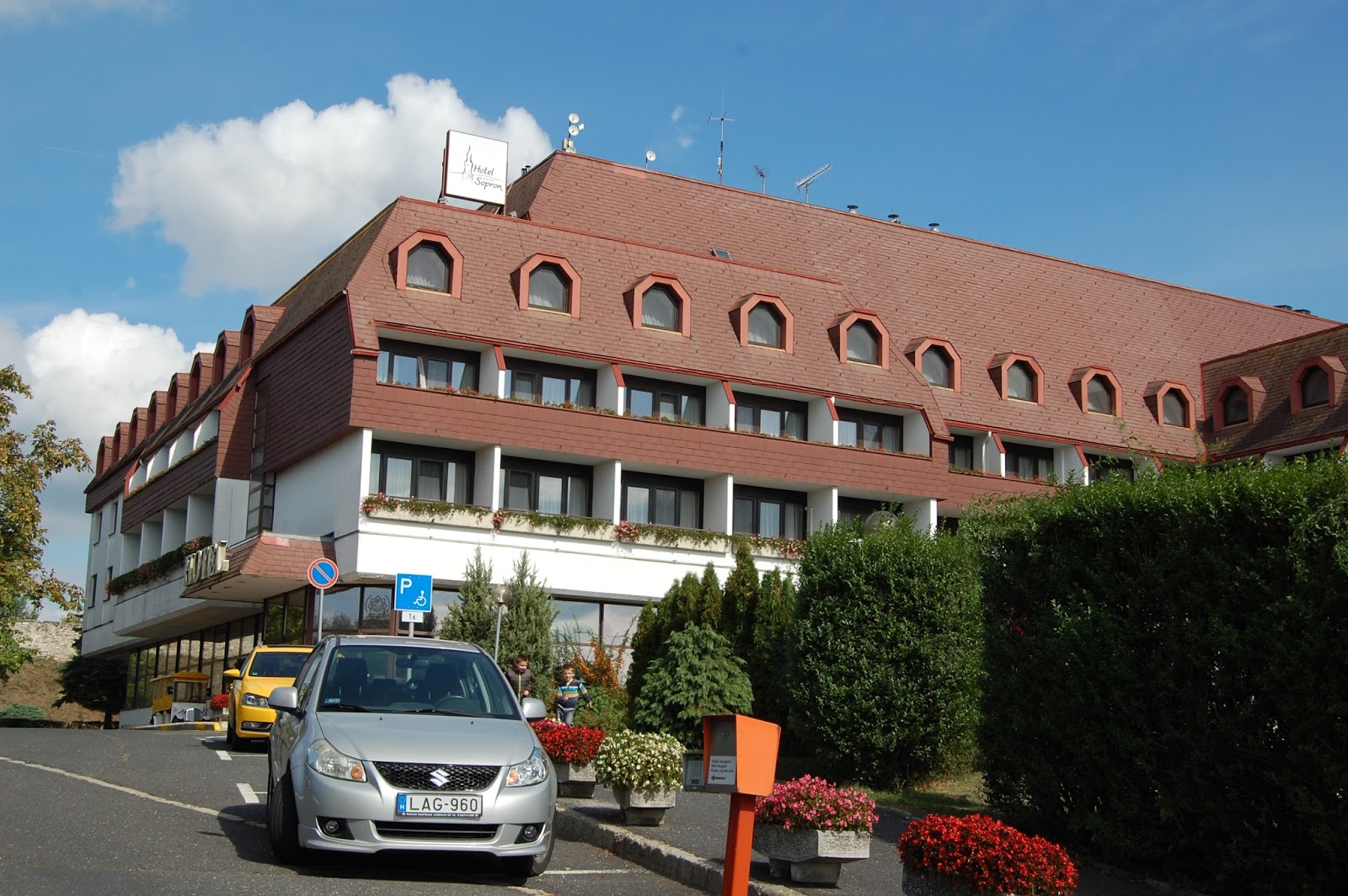 Ezen a képen talán létszik jobbra az a hatalmas bicikliszállító utánfutó, amely német nyugdíjasok saját kerékpárját szállította Sopronig. A Hotel főbejárata előtt áll. |